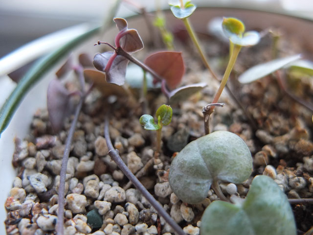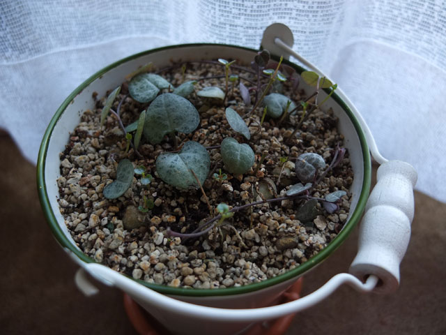 約1ヶ月前に ちょんぎって植え替えた 「ハートカズラ」 つんつんと新芽が出てきました。 家の中だから ひょろひょろだけれどね。 あれ・・・。写真縮めたら 殆ど見えていない(^^;;