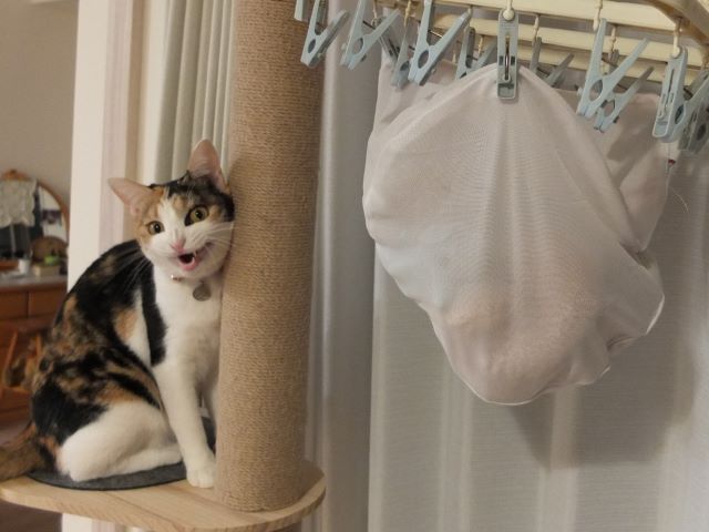 瑠奈の猫タワーにかけたら 何やら文句を言っています。