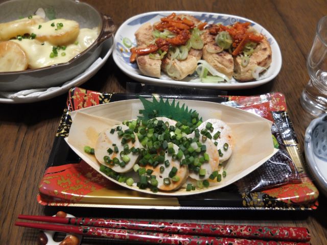 あと 焼いた油揚げは 長ネギと「柿の種のオイル漬け」で。